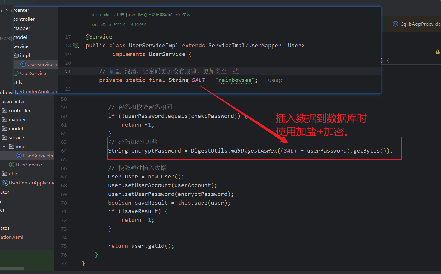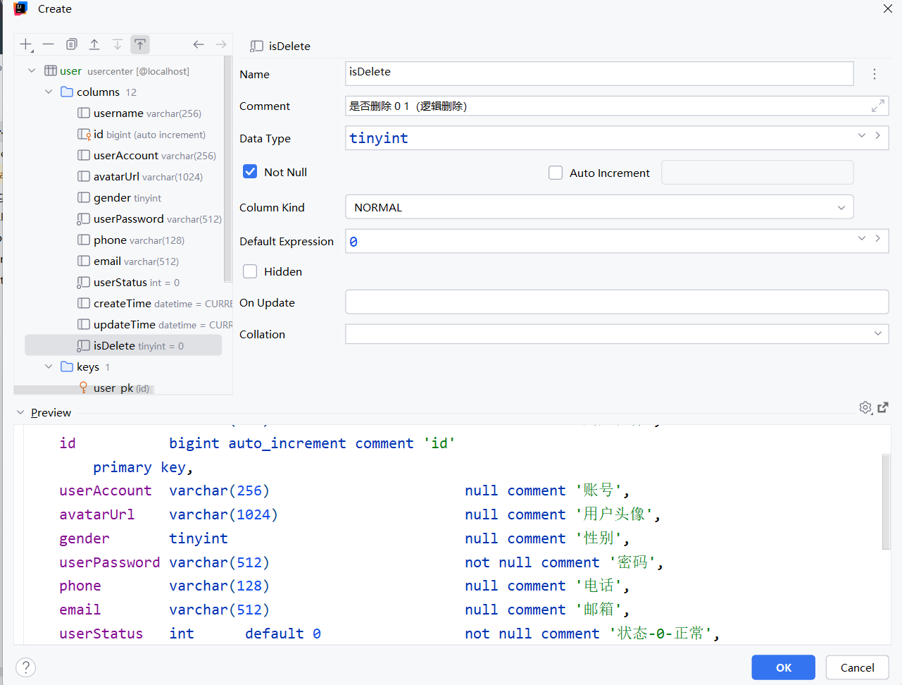 同时这里我们对数据库重新更新了一下,添加了一个 userRole 角色字段,userRole int default 0 not null comment '用户角色 0- 普通用户 1 - 管理员 2 - vip'
