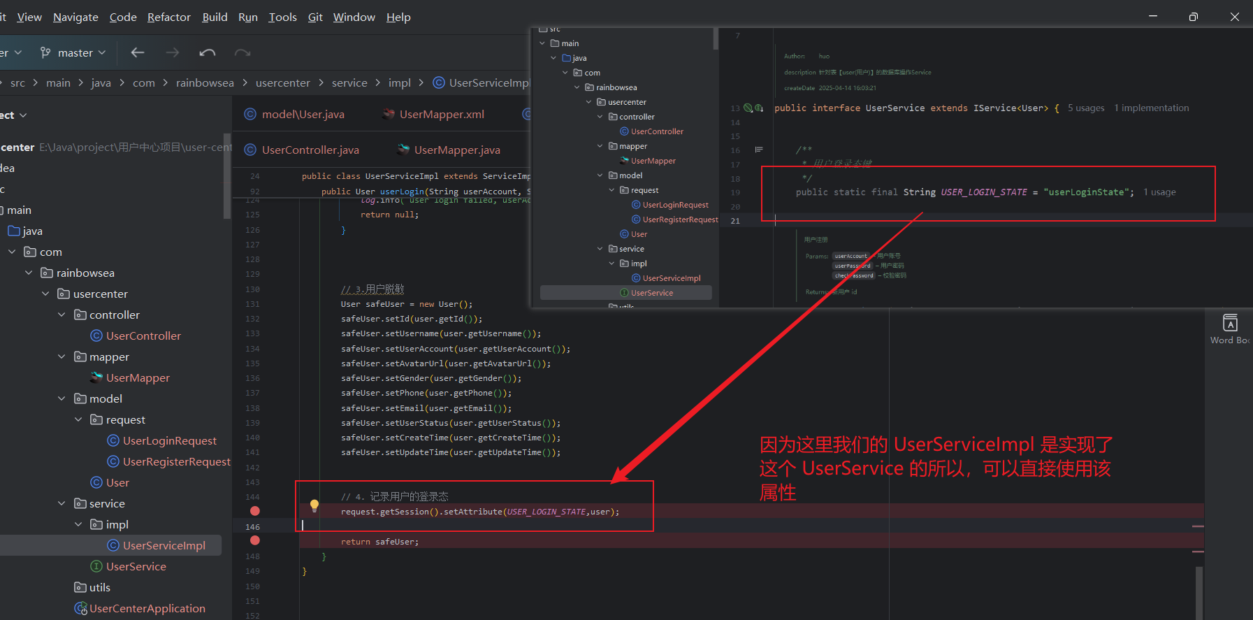 这里我们优化将我们的一个 用户登录态键配置在,这里的 UserService的接口当中,这样我们就可以在多个位置上进行引用该用户登录态键,作为,一个判断用户是否登录的一个操作。