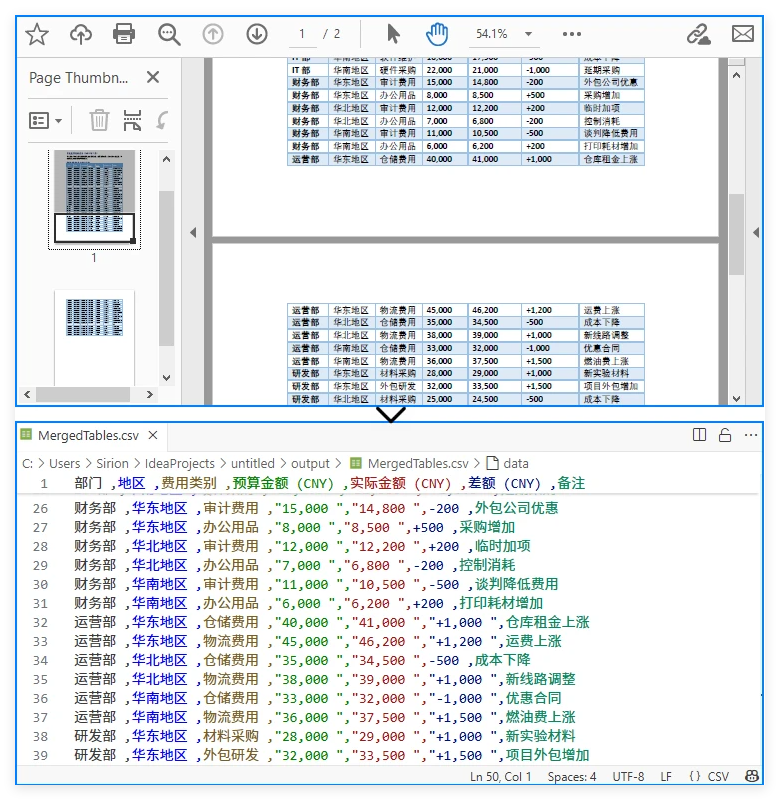 示例:将跨多页的大表格合并为一个 CSV 文件: